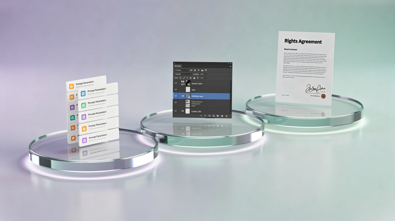 使用 Photoshop 調整構圖、色彩或合成元素。修改幅度越大,人類創作比例越高,受保護機率越大。單純濾鏡調整不夠,需要涉及圖層合成、手繪修補或元素替換。保留 PSD 檔的圖層紀錄作為證據,證明人類勞動的投入。